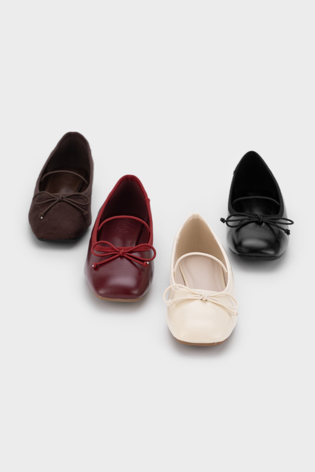 Our square-toe ballet flats put a modern spin on a classic favourite with a sleek squared front, dainty bow and slim elastic strap that hugs your feet just right. A soft faux-leather upper  and flexible outsole keep you comfy from commute to café run, while the minimalist profile pairs effortlessly with jeans, tailored trousers or a flirty sundress. Available in timeless black, creamy vanilla and rich wine red—one for every mood on your calendar.